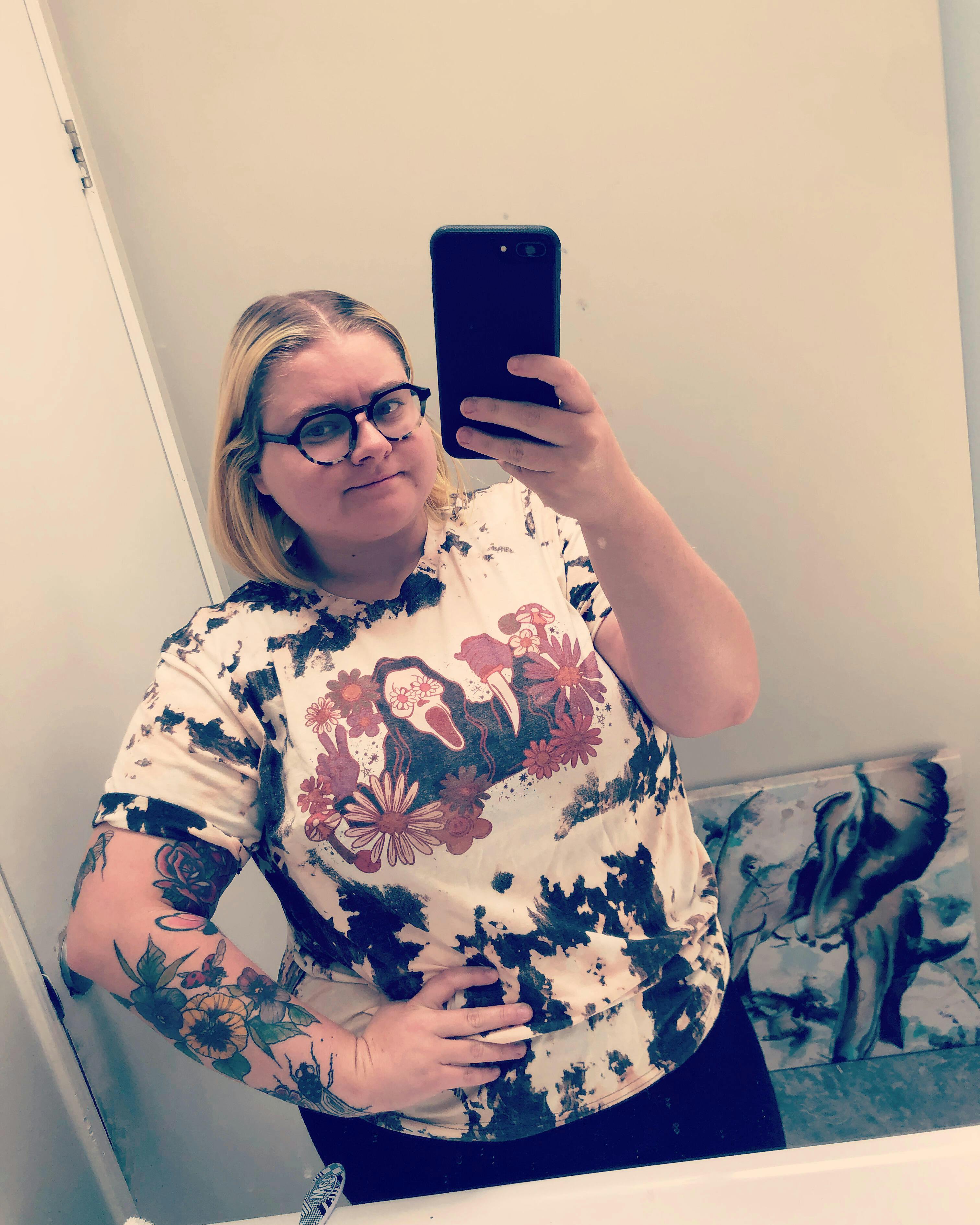 I absolutely love my ghost face shirt! The peach color is beautiful, the shirt is so soft and comfy, and the design is a perfect combination of horror and retro fem vibes! Definitely one of my new favorite shirts!